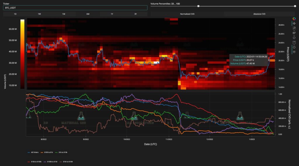 Analizując skład księgi zamówień dla BTC/USD na największej giełdzie Binance, Material Indicators wyraziło zdziwienie, iż ci, którzy licytowali Bitcoina wyżej, nie uzyskali jeszcze wsparcia.
