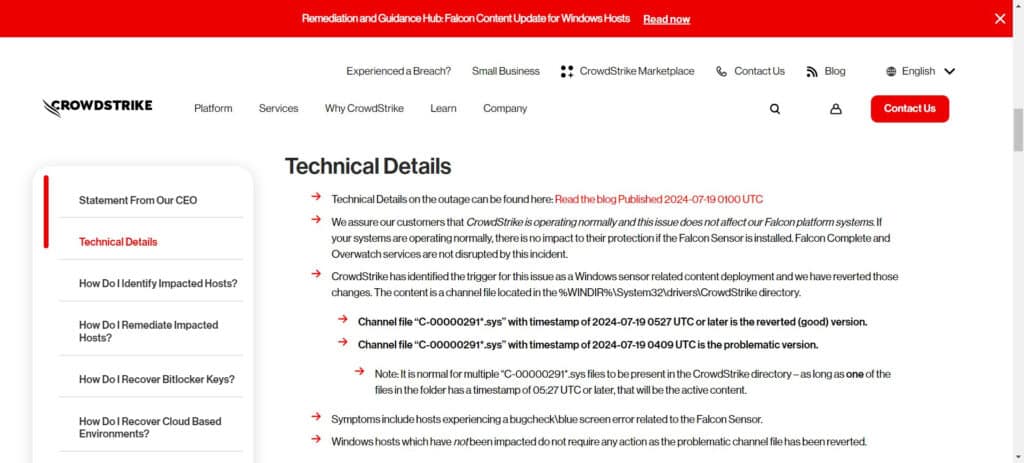 Opis techniczny zaistniałego problemu opublikowany na stronie internetowej CrowdStrikeOficjalny komunikat w sprawie opublikowała firma Microsoft. „Obecnie szacujemy, iż aktualizacja CrowdStrike dotyczyła 8,5 miliona urządzeń z systemem Windows, czyli mniej niż jeden procent wszystkich komputerów z systemem Windows. Chociaż odsetek ten był niewielki, szerokie skutki gospodarcze i społeczne odzwierciedlają korzystanie z CrowdStrike przez przedsiębiorstwa świadczące wiele kluczowych usług” – napisano na blogu.