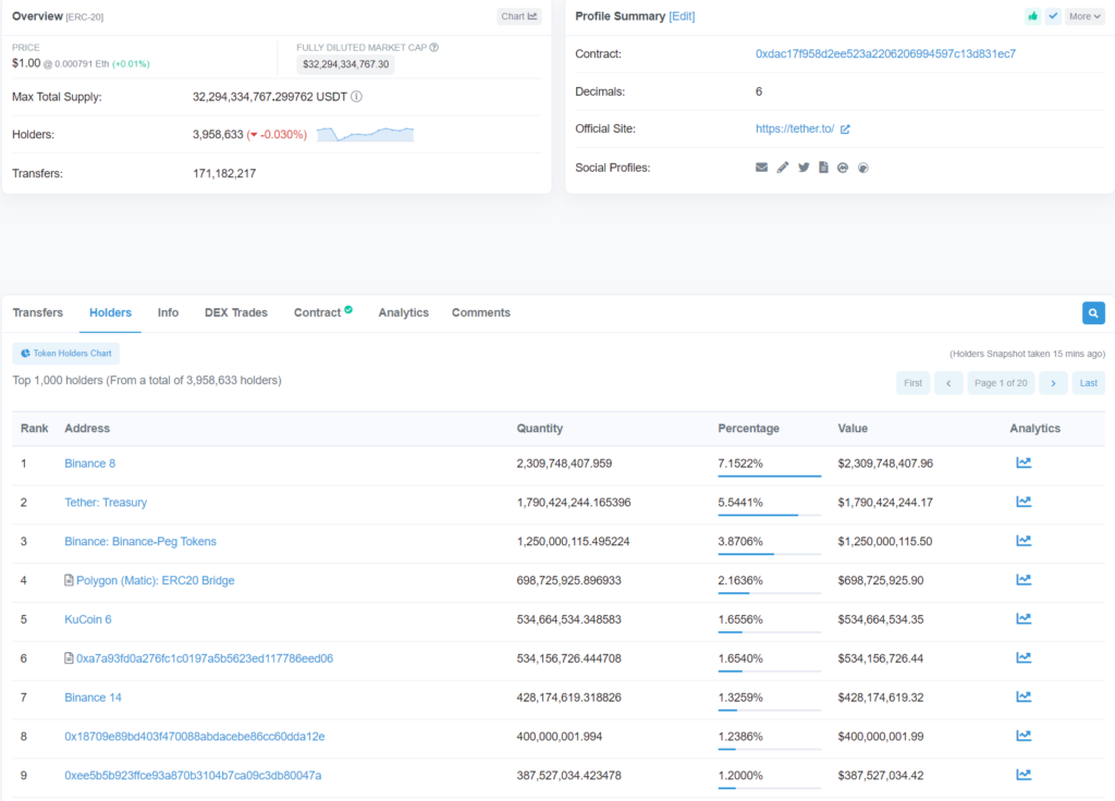 Przejrzystość smart kontraktów pozwala np. określić szczegółowo posiadaczy danych tokenów. Na obrazku top9 posiadaczy tokenów USDT na sieci EthereumJak działa token ERC-20 ?