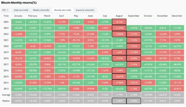 Źródło: GlassnodeOptymizmem nie napawają dane historyczne, które ujawniają, iż dotychczas w sierpniu Bitcoin zwykle tracił na wartości. W poprzednich latach Bitcoin tracił średnio 7,8% w tym miesiącu.