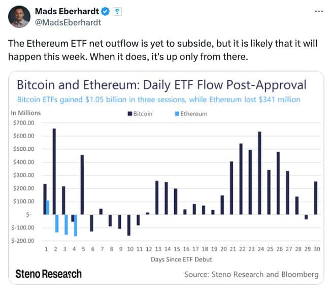 Zdaniem Madsa Eberhardta, starszego analityka w firmie Steno Research, masowe odpływy z ETHE Grayscale ustąpią w tym tygodniu. Postrzega on jednak silne wczesne odpływy jako powód do zwyżki w krótkim okresie. – Odpływ ETF Bitcoin Grayscale znacznie ustąpił po jedenastej sesji giełdowej – zaznaczył. – Ponieważ ETF Ethereum Grayscale doświadczyło znacznie wyższego odpływu w stosunku do AUM, uważamy, iż szczyt odpływu nastąpi w tym tygodniu – dodał.