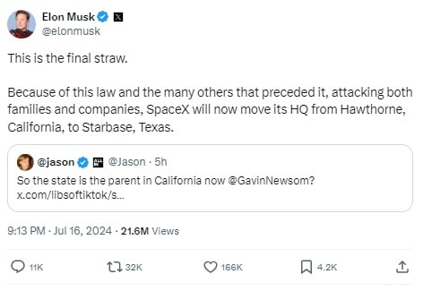 Miliarder już od jakiegoś czasu nie był zadowolony z szeroko rozumianego otoczenia i regulacji prawnych, które obowiązują w Kalifornii. Nowe prawo kalifornijskie zabraniające okręgom szkolnym wymagania od nauczycieli powiadamiania rodziców o zmianie tożsamości płciowej lub orientacji seksualnej dziecka było jednym z powodów wtorkowego ogłoszenia. Musk stwierdził na X, iż to prawo stanowi zagrożenie zarówno dla rodzin, jak i firm.
