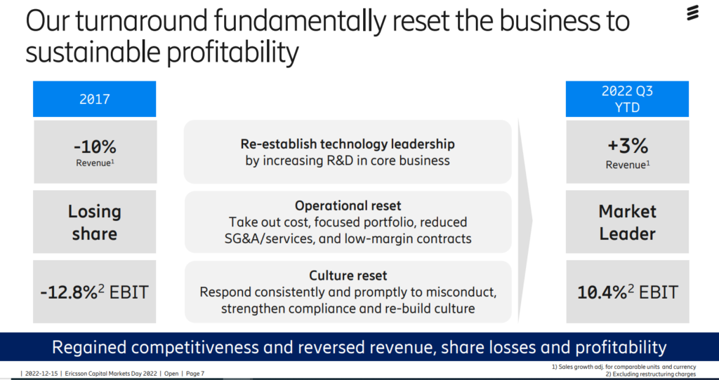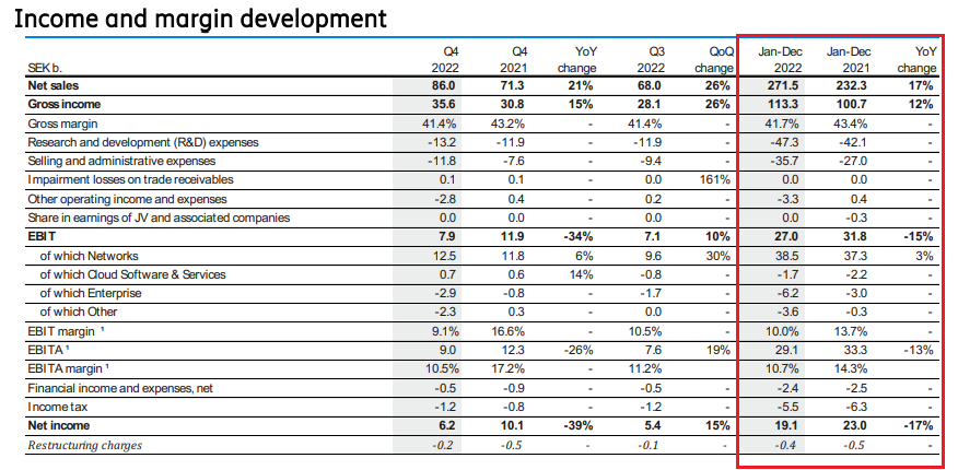 źródło: raport roczny spółkiJak widać na obrazie powyżej, Ericsson wygenerował w 2022 roku 271,5 mld koron przychodu. Oznaczało to, iż w ciągu roku sprzedaż poprawiła się o 17% tj. o 39,2 mld SEK. Jednocześnie spółka zaczęła mieć problem z rentownością. Marża brutto ze sprzedaży spadła z 43,4% do 41,7%. Co więcej zysk operacyjny (EBIT) spadł o 15% r/r do 27 mld koron. Marża operacyjna spadła z 13,7% do zaledwie 10,0%. Zarząd zdał sobie sprawę, iż konieczna jest restrukturyzacja kosztów.