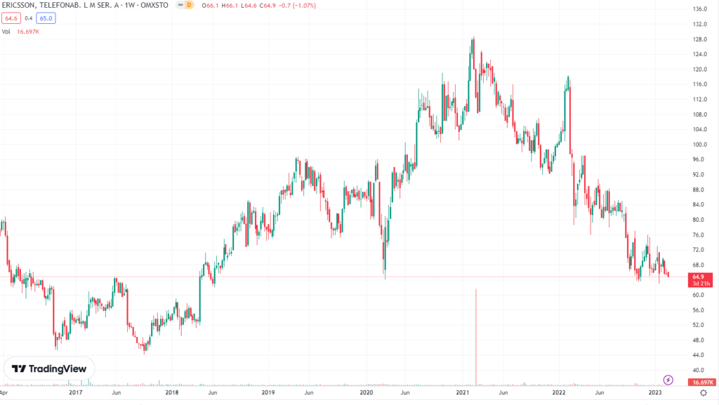 Od lutego 2021 roku spółka znajduje się w trendzie spadkowym. W ciągu dwóch lat cena akcji Ericsson spadła o 50%. w tej chwili kurs spółki znajduje się blisko wsparcia jakim jest strefa popytu znajdująca się w okolicy “covidowego” dołka z marca 2020 roku (64,1 SEK). W przypadku jego przebicia, kolejnym wsparciem są okolice styczniowego dołka (63 SEK). Po jego przebiciu można oczekiwać ruchu w okolice 59-60 SEK.