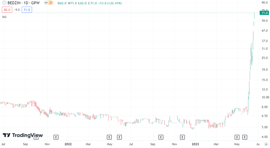 Jednak w czerwcu kurs akcji zaczął bardzo gwałtownie rosnąć. Do 21 czerwca 2023 roku kurs akcji wzrósł o ponad 800%. Logiczne wydawałoby się, iż pojawiła się informacja, która zmieniła perspektywy firmy. Jednak jedyne komunikaty, jakie pojawiały się to kupowanie akcji przez insiderów. Oprócz tego znacznie wzrósł obrót na spółce. Pojawił się silny popyt, który znacznie przekraczał wolumen obrotu w ciągu ostatniego roku. Gwałtowny wzrost popytu w połączeniu z ograniczoną podażą akcji doprowadziły do dynamicznego wzrostu kursu Będzina.