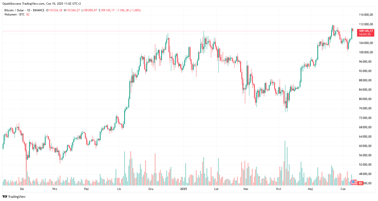 W momencie pisania tego artykułu kurs bitcoina wynosi 109 125 dolarów. Największa z kryptowalut jest oddalona od swojego ATH wynoszącego 111 970 dolarów o 2,56%.