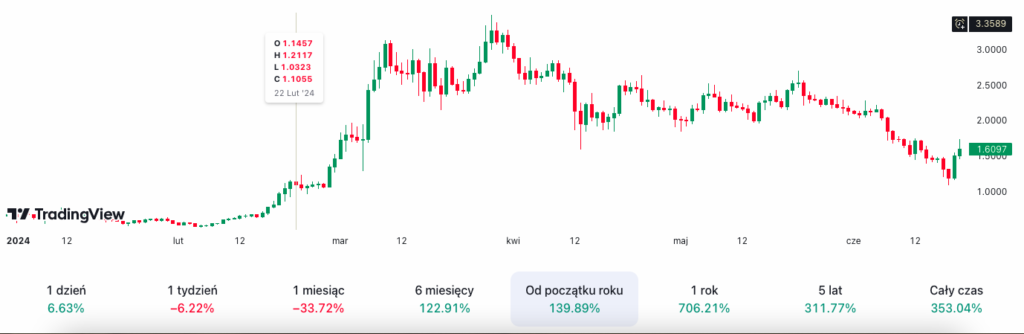 Ethereum Name Service (ENS) mogło zarobić dodatkowe zainteresowanie naturalnie w wyniku wiadomości dotyczących SEC i ETH. Fetch.ai (FET) z kolei przyciągnęło uwagę, notując wzrost ceny o około 30% w ciągu zaledwie jednego dnia. Rajd tej kryptowaluty związanej z AI nieprzypadkowo zbiegł się z sukcesem NVIDIA. Firma ta stała się największym przedsiębiorstwem pod względem kapitalizacji rynkowej, przekraczając 3,33 biliona dolarów.