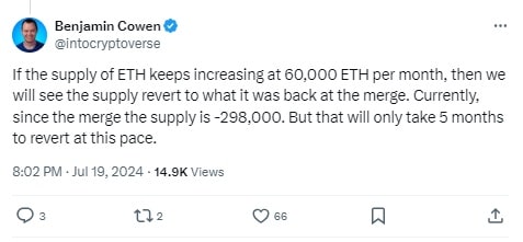 Źródło: https://x.com/intocryptoverse/status/1814360186297167875Cowen prognozuje, iż początkowy szum wokół ETF-ów spowoduje, iż ETH spadnie. Szczególnie jeżeli jego podaż będzie przez cały czas rosnąć w obecnym tempie. W raporcie z 19 lipca analityk napisał: „Jeśli podaż ETH będzie przez cały czas rosła o około 60 tys. miesięcznie, tak jak to miało miejsce od kwietnia, to do grudnia podaż powróci do poziomu sprzed fuzji”.
