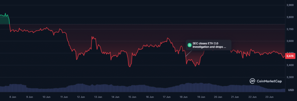 Na moment powstawania tego artykułu cena kryptowaluty Ethereum wynosiła ok. 3475 dolarów za sztukę i przez cały czas zsuwa się wewnątrz krótkoterminowego kanału spadkowego trwającego od mniej więcej początku czerwca.