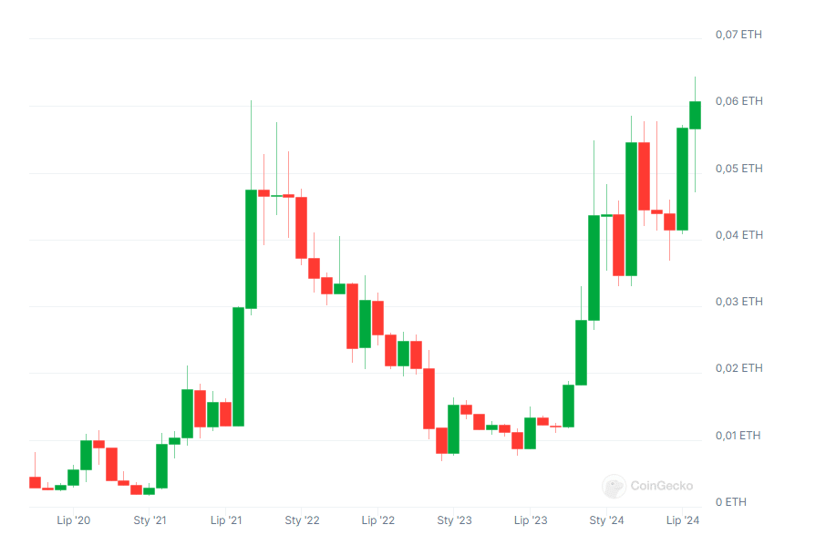 Jeśli spojrzeć na wykres pary SOL/ETH (Solana denominowana w tokenach Ethereum i odwrotnie), to od początku 2024 r. mamy do czynienia z wyraźnym, silnym impulsem na północ, w wyniku którego z każdym kolejnym miesiącem za kryptowalutę SOL musimy zapłacić coraz to więcej eterów. To ogromny sukces „słonecznego blockchainu”. Mieliśmy co prawda już w 2021 r. podobną sytuację, ale miała ona miejsce wyłącznie krótkotrwale i wzięła się ona z szału na tokenach niezamiennych (NFT) które od tamtego czasu szorują po dnie. Tym razem jednak Solanę przygarnęła „ulica”, a konkretnie kryptowaluciarze inwestujący w memecoiny, projekty gamingowe, a także zdecentralizowane finanse (DeFi).