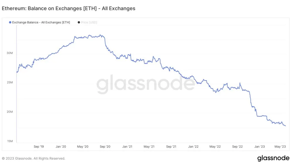 Na podstawie danych udostępnionych przez Glassnode i Nansen można zauważyć, iż liczba Ethereum przechowywanego na scentralizowanych giełdach (ang. Centralized Exchanges; CEXes – przyp. red.) zbliża się do najniższego poziomu od pięciu lat. w tej chwili na giełdach znajduje się ok. 17,8 milionów tokenów ETH, co stanowi 14,85% ogólnej podaży w sieci. Choć jest to wciąż duża liczba, to wynosi ona znacznie mniej niż szczytowa wartość z lata 2020 roku, kiedy to osiągnięto poziom 30%.