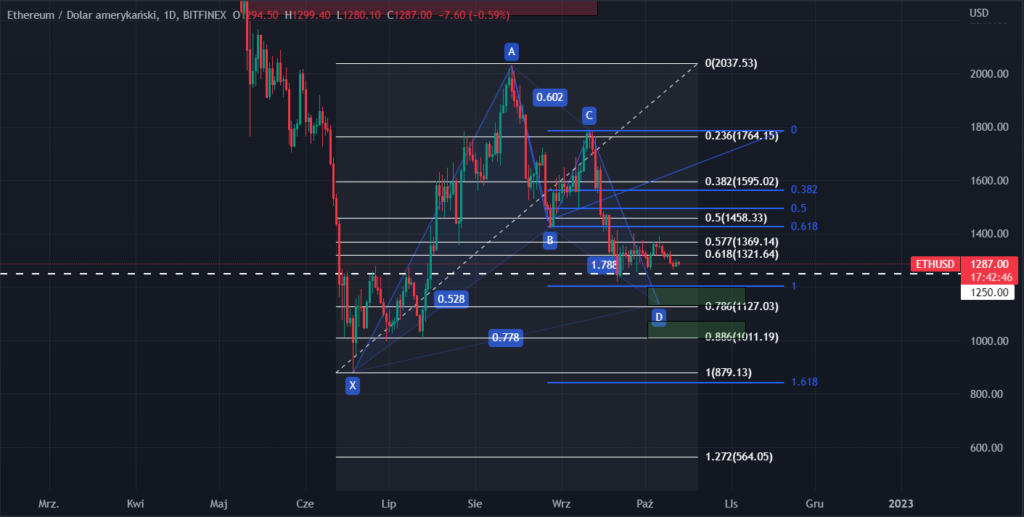 Na moment pisania artykułu cena ETH wynosi lekko poniżej 1300$. Na wykresie dniowym w tej chwili od 3 tygodni jest konsolidacja cenowa i kryptowaluta porusza się między wartościami 1200$ – 1400$. zwykle takie konsolidacje są wybijane zgodnie z trendem, czyli w tym przypadku nastąpiłoby wybicie dołem w kierunku 1100$ lub 1000$ w niedalekiej przyszłości. w tej chwili cały czas broniony jest poziom wsparcia w rejonach 1250$, który w przeszłości był testowany jako opór, a teraz wielokrotnie jako wsparcie.