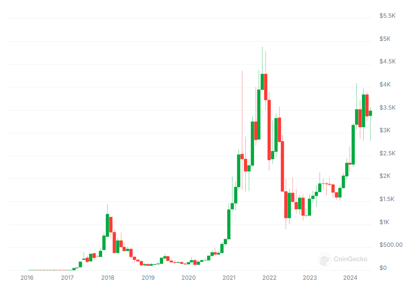 Wykres ceny kryptowaluty Ethereum (ETH), źródło: CoingeckoQCP Capital: ETH z sygnałem kupna, póki jest tanio