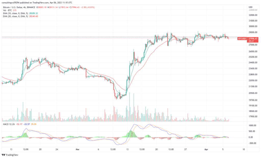 Dane z TradingView pokazują, iż cena Bitcoina odnotowała wahania w ciągu dnia 3,13%. Podczas handlu w środę Bitcoin wspiął się do najwyższego poziomu 28 834 USD we wczesnych godzinach handlu i spadł do 27 935 USD. Warto zawuażyć, iż każdy spadek ceny BTC poniżej 28000 USD wykorzystywany jest do zakupów. A cena gwałtownie powraca powyżej okrągłego poziomu.