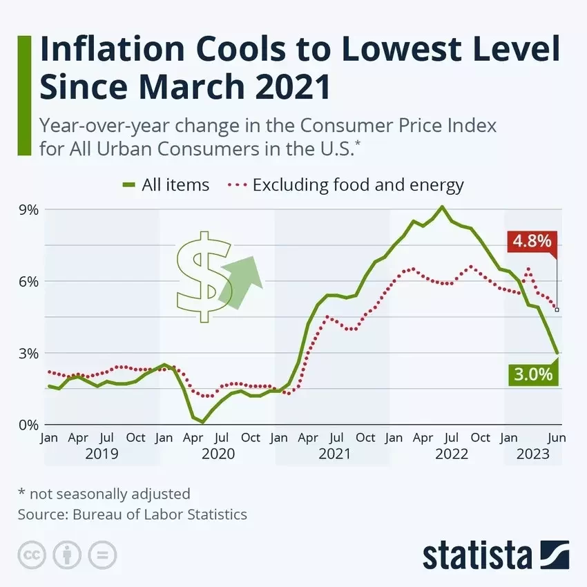 — Evan (@StockMKTNewz) July 14, 2023Uwagę inwestorów przyciągnał przede wszystkim odczyt inflacji, która pokazała dynamiczny spadek. Raport spodobał się inwestorom. Co więcej, Wall Street oczekuje, iż inflacja bazowa także spadać w nadchodzących miesiącach. Wraz z pierwszymi oznakami spadku cen najmu. Spadek presji cenowe za oceanem sprawił, iż giełda zacznęła ponownie oceniać szanse na koniec najagresywniejszego cyklu podwyżek stóp od lat 80-tych. Inflacja CPI w czerwcu wzrosła o 3% r/r, wobec 4% w maju. To najniższy r/r wzrost od marca 2021! Do celu Fed brakuje już tylko 1%. Bazowa CPI (bez cen energii i żywności) wyniosła 4,8% w czerwcu – najniżej od października 2021. Co więcej, sporej recesji i zapaści gospodarczej wciąż nie widać. Na giełdach zatem leje się szampan.