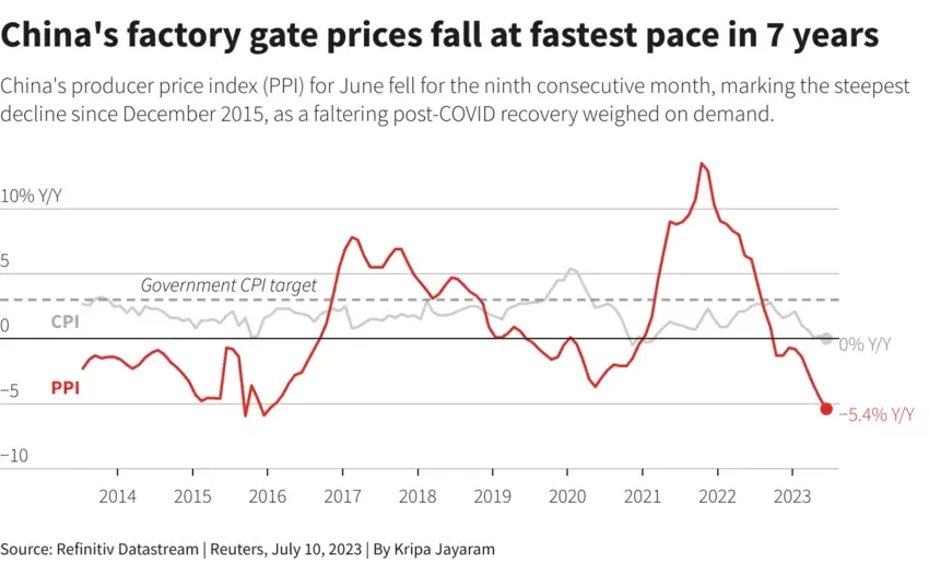 Międzynarodowy Fundusz Walutowy wskazał, iż Chiny stoją przed ryzykiem deflacji, a globalny wzrost gospodarczy wciąż wygląda na 'mglisty’. Według analizy funduszu zagrożenie deflacją, jest zwiastunem zapaści gospodarczej rośnie w Chinach. Krajowy wskaźnik cen producentów (PPI) spadał w najszybszym tempie od siedmiu lat, przy niezmiennym CPI. Druga co do wielkości gospodarka świata odnotowała w czerwcu spadek PPI o 5,4%, wobec 4,6% w maj. Był to zaraze dziewiąty miesiąc z rzędu, w którym wskaźnik spadał. Inflacja CPI pozostała niemal bez zmian po tym jak w maju wzrosła o 0,2%. Niskie ceny w fabrykach nie dają złudzeń – problemem w Chinach jest niski popyt.