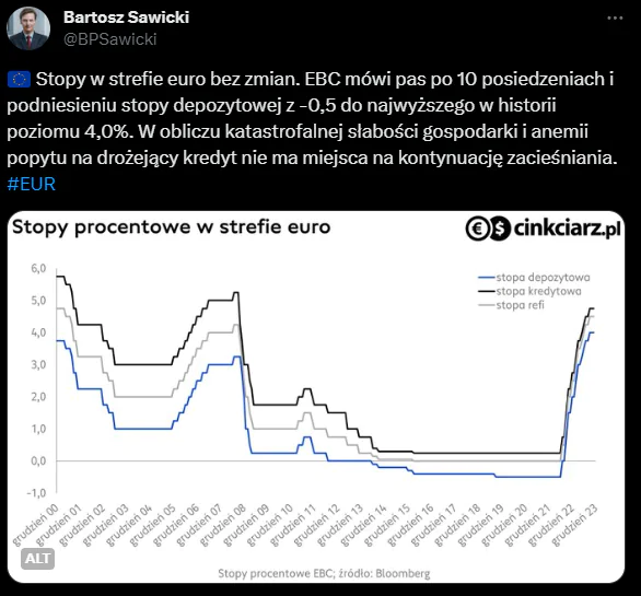 Źródło: X (Twitter)Rada Prezesów Europejskiego Banku Centralnego podkreśliła, iż ważne jest utrzymanie stóp procentowych na obecnym poziomie przez wystarczająco długi okres, aby zapewnić powrót inflacji do celu inflacyjnego który wyznaczono na poziomie 2%. W przyszłości decyzje dotyczące stóp będą dalej oparte na ocenie perspektyw inflacji oraz dotychczasowej dynamice inflacji bazowej.
