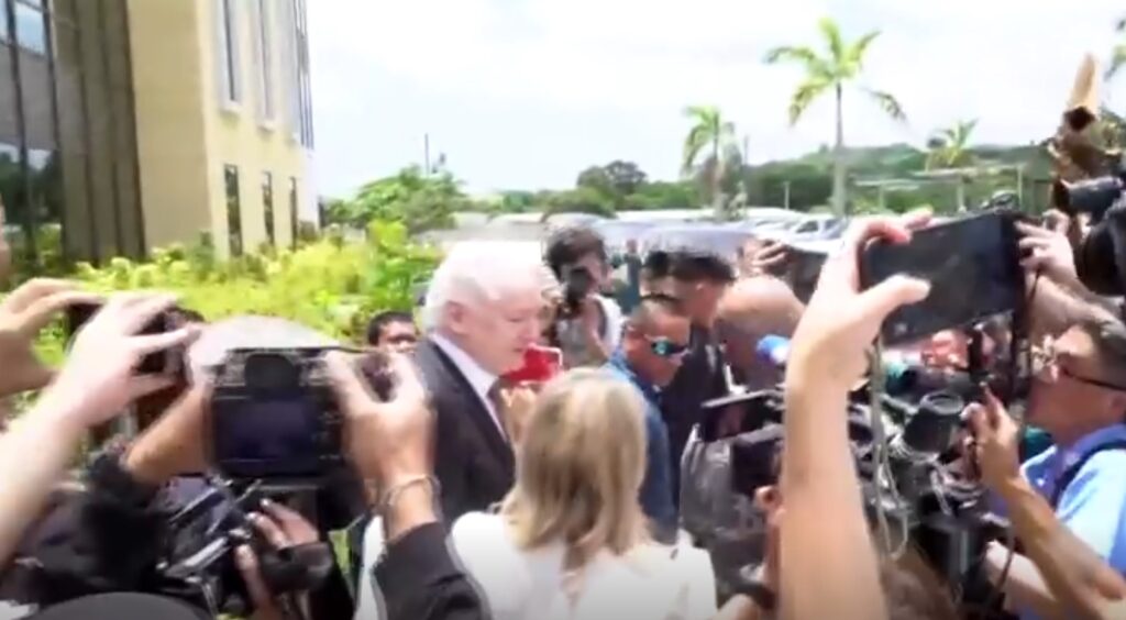 Julian Assange po wyjściu z sądu (fot. YouTube)Przypomnijmy – 24 czerwca Assange został zwolniony z więzienia o zaostrzonym rygorze Belmarsh w Wielkiej Brytanii po osiągnięciu porozumienia z władzami USA. Niedługo później opuścił Wielką Brytanię prywatnym samolotem z londyńskiego lotniska do Saipan na Marianach Północnych, które leżą na terytorium Stanów Zjednoczonych. Mężczyzna pojawił się w sądzie okręgowym w Saipan 26 czerwca, gdzie przyznał się do jednego zarzutu – naruszenia amerykańskiej ustawy o szpiegostwie poprzez wyciek tajnych dokumentów. Jego podróż została zaplanowana tak, aby uniemożliwić Assange’owi postawienie stopy na amerykańskiej ziemi.