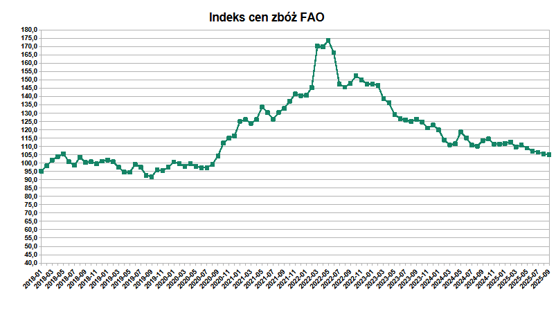 We wrześniu 2025 roku wskaźnik cen zbóż FAO wyniósł średnio 105,0 punktów, co stanowi spadek o 0,6 punktu (-0,6 procent) w porównaniu z sierpniem i w konsekwencji poziom indeksu cen zbóż najniższy od września 2020 roku (patrz wykres). W skali roku indeks cen zbóż spadł o 7,5 procent.