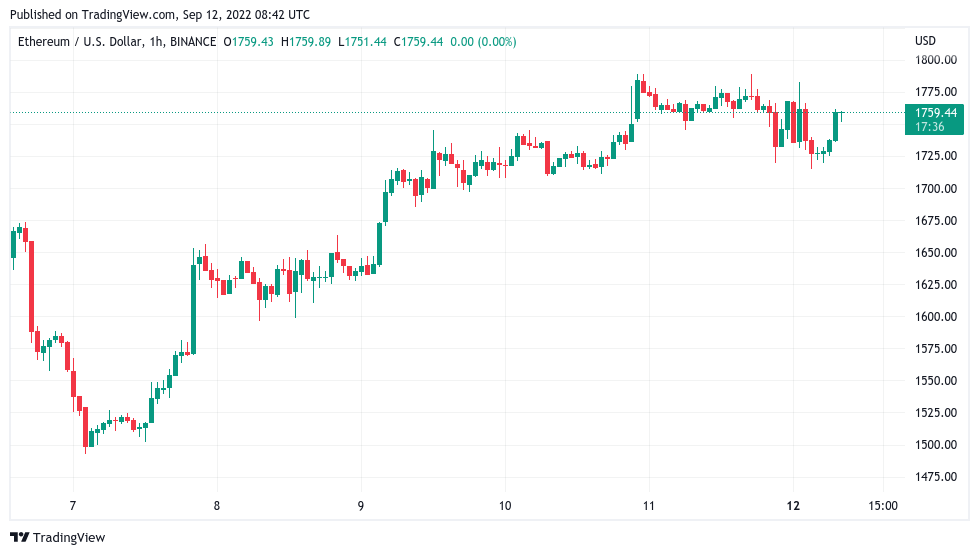 W momencie pisania ETH/USD notował trend spadkowy drugi dzień z rzędu, osiągając 1760 USD po osiągnięciu lokalnych maksimów 1790 USD.