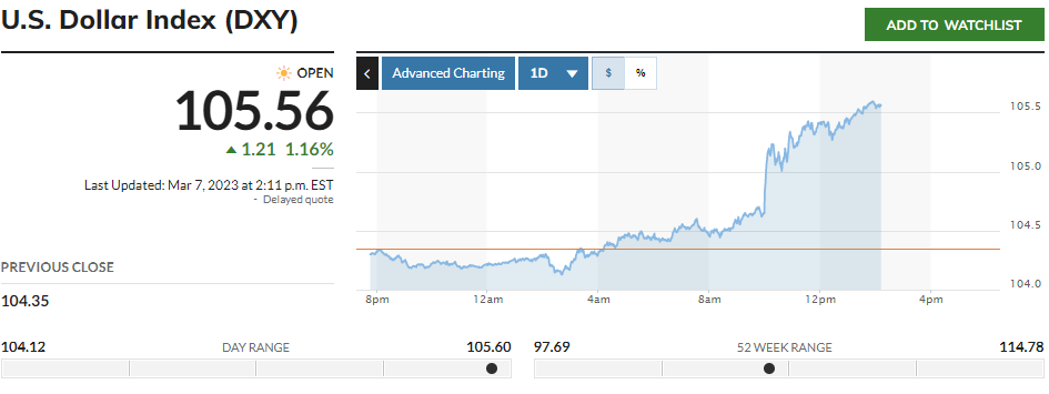— Bloomberg (@business) March 7, 2023Wskaźnik międzybankowej stopy procentowej LIBOR, benchmarka pokazującą cenę pieniądza a także kredytów i depozytów przekroczył poziom 5% po raz pierwszy od 15 lat. Rynki dyskontują więc scenariusz jeszcze wyższych niż przewidywano stóp procentowych.