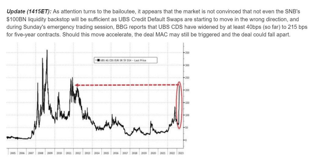 Niepokojący jest fakt, iż swapy ryzyka kredytowego UBS gwałtownie wzrosły. Rynek spekuluje na nich mimo 100 mld CHF pożyczki z SNB. Tylko w niedziele swapy ryzyka kredytowego dla UBS wzrosły o 4%, do poziomów niewidzianych od czasu kryzysu zadłużenia, gdy bankrutowała Grecja. Oznacza to, iż rynek wciąz nie widzi końca problemów w europejskim systemie finansowym. Przejęcie Credit Suisse może tymczasowo zakamuflować problem. Ale nie oznacza, iż wszystkie napięcia sektora finansowego osłabły. Uwaga rynków będzie teraz skupiona wokół UBS jako potencjalnego 'nabywyc toksycznego banku’. Po 2008 roku bank UBS był jednak znacznie lepiej zarządzany od Credit Suisse, zatem jest nadzieja iż wzrost jego aktywów pod zarządzaniem (AUM) przełoży się na lepszy wynik. Na samym wstępie bank zamierza zlikwidować przynoszący straty oddział inwestycyjny banku Credit Suisse.