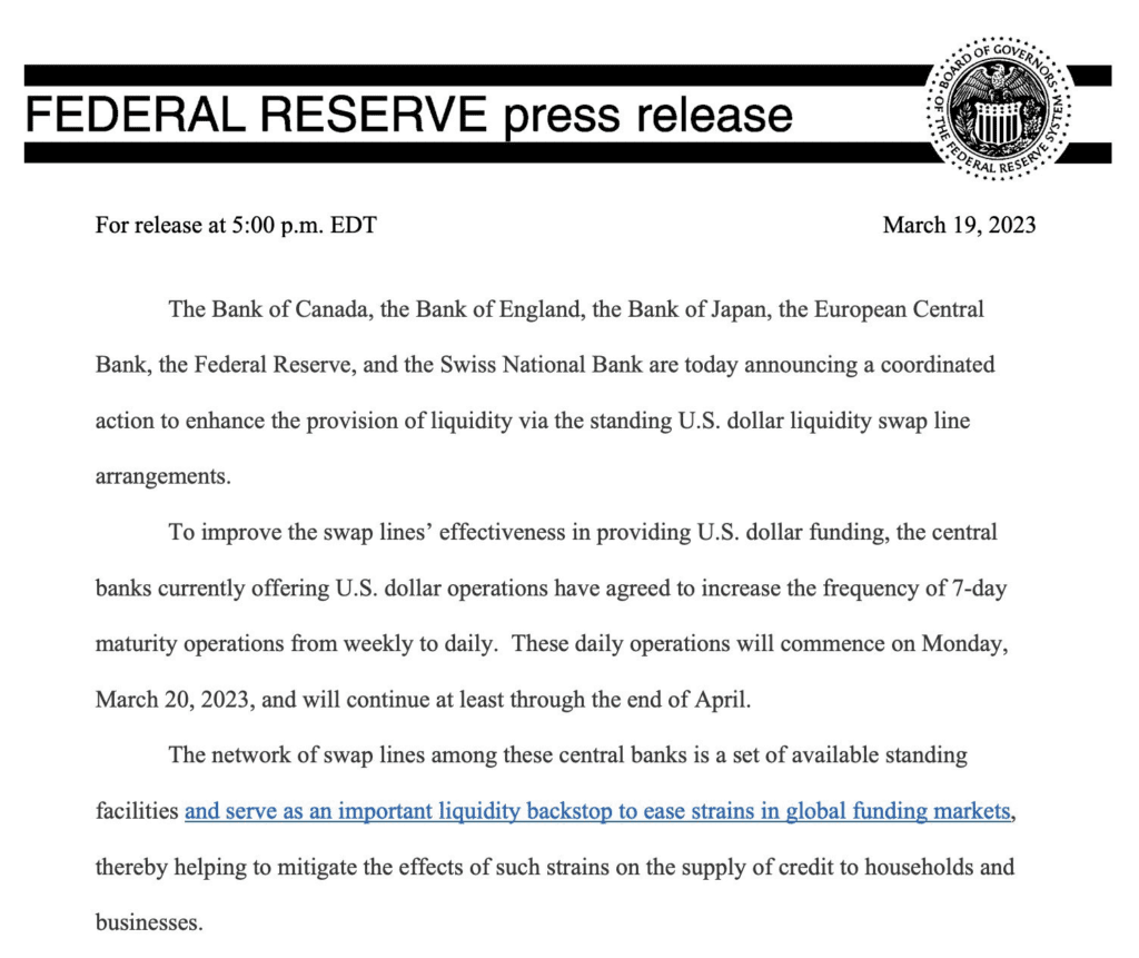 Drugi największy bank Szwajcarii zostanie wchłonięty przez największy, szwajcarski bank – UBS. Sytuacja CS musiała być naprawdę fatalna. Dlaczego? Ponieważ UBS wynegocjował świetne warunki kupna i zapłacił za bank 3 mld CHF. To około 40% wartości wycenianej przez rynek na piątkowym zamknięciu sesji i prawie 1/15 wartości księgowej Credit Suisse. Przed otwarciem rynków azjatyckich świat obiegła informacja o wspólnym oświadczeniu ze strony największych banków centralnych. Regulatorzy prawdopodobnie chcieli uspokoić nastroje rynku finansowego i pokazać wspolne wsparcie dla sektora bankowego. Wyjaśnijmy najpierw co oznacza to oświadczenie nim spróbujemy przeanalizować sytuacje UBS. Rynki finansowe przyjęły je bardzo pozytywnie, dopatrując się w nim kapotu rzuconego wszystkim bankom.