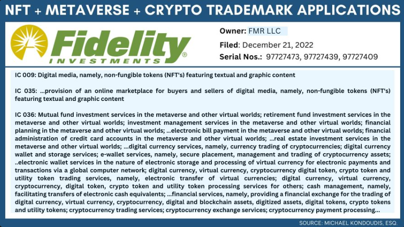 Licencjonowany prawnik zajmujący się znakami towarowymi, Michael Kondoudis, zwrócił uwagę na wnioski dotyczące znaków towarowych złożone przez Fidelity w tweecie opublikowanym w poniedziałek, pokazując, iż korporacja świadcząca usługi finansowe chce zaangażować się w NFT i rynki NFT, usługi inwestycyjne Metaverse, inwestowanie w wirtualne nieruchomości i handel kryptowalutami.