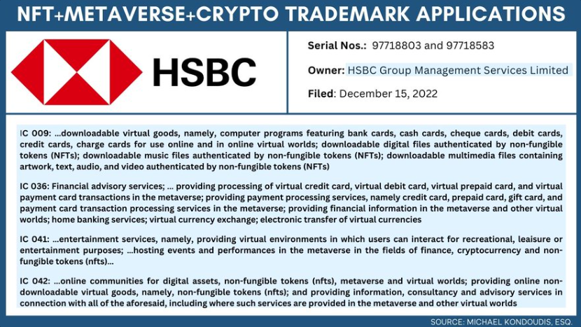 Bliższe przyjrzenie się grafice, którą Kondoudis załączył do swojego tweeta, pokazuje, iż wnioski o znak towarowy zostały złożone 21 grudnia, a także wspomina o planach stworzenia usług inwestycyjnych w zakresie funduszy inwestycyjnych w Metaverse, usług inwestycyjnych funduszy emerytalnych w Metaverse, planowania finansowego w Metaverse między innymi przetwarzanie płatności metaverse i kryptowalut.