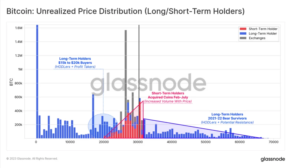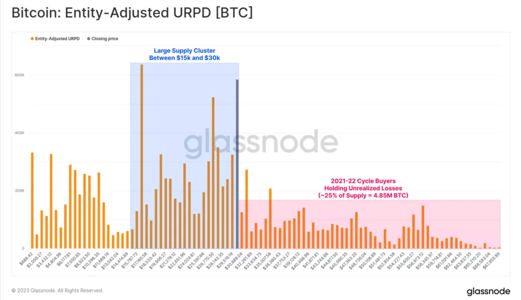 Źródło: GlassnodeGlassnode wskazuje, iż ożywienie na rynku Bitcoina w 2023 r. było niezwykle solidne. Zarówno z punktu widzenia ceny, jak i wykorzystania sieci. Wykres pomaga spojrzeć na to z perspektywy podstaw podaży, która została nabyta po cenach poniżej 30 tys. dolarów. Widzimy, iż strefa podaży między 15 a 30 tys. USD jest znacząca. To pokazuje, iż duża ilość BTC zmieniła właściciela w ciągu ostatnich 12 miesięcy. Jednocześnie 25% całkowitej podaży (ok. 4,85 mln BTC) nabyło BTC powyżej 30 tys. USD (kupujący z cyklu 2021 – 2022).
