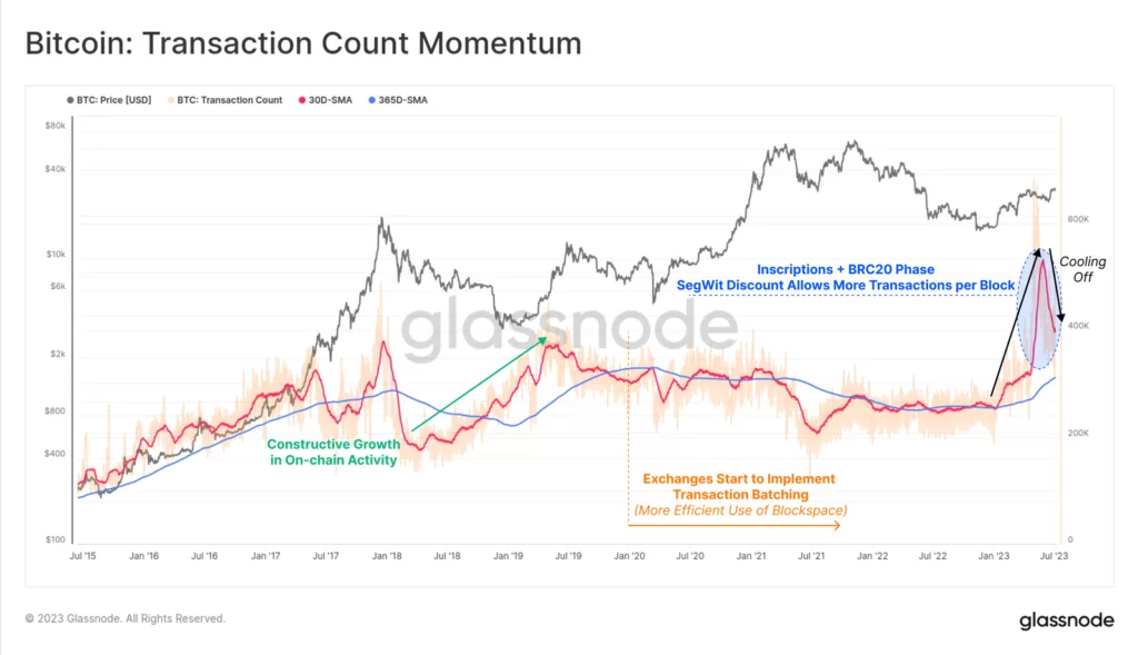 — Dennis Porter (@Dennis_Porter_) July 12, 2023Czy doprowadzi to ostatecznie do wzmożnonego zainteresowania możliwościami BTC? Na tą chwilę to wciąż leży w sferze spekulacji, a Modern Monetary Theory (MMT) działa. Do czasu, kiedy przestanie. Tymczasem dla samego Bitcoina, w krótkim horyzoncie kilku miesięcy Glassnode spodziewa się raczej konsolidacji. Maksymalny 'drawdown’ w tym roku wyniósł zaledwie -18%. Aktywność on-chain nieco się ochładza ale wolumeny transferów pieniężnych rozpoczęły wzrost. Istnieje więc poówd by przypuszczać, iż płynność poprawia się stopniowo.