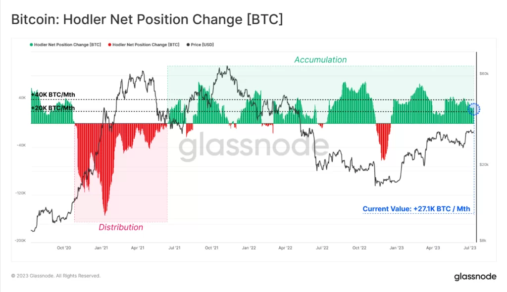 Źródło: GlassnodeDługoterminowi inwestorzy (HODLerzy) akumulują Bitcoiny w tempie ponad 27,1 tys BTC / miesięcznie.