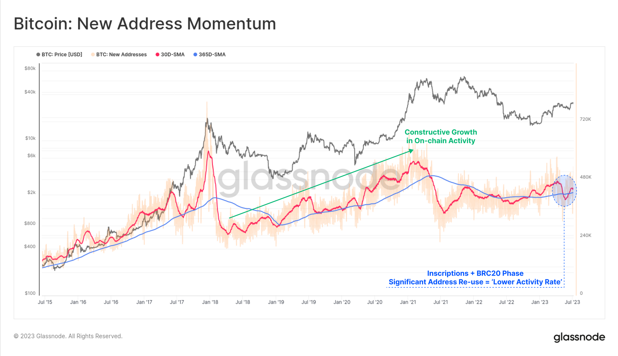 Źródło: GlassnodeDynamika aktywnych adresów zaczęła ponownie rosnąć. Jednocześnie jednak ostatnie 2/3 miesiące to widoczny spadek aktywności sieci. Możliwe jednak, iż był to po prostu efekt znacznego ponownego wykorzystania adresów przez traderów, którzy zachłysnęli się modą na inskrypcje. Wówczas możemy przyjąć, iż aktywność sieci kwitnie, a bloki są pełne.