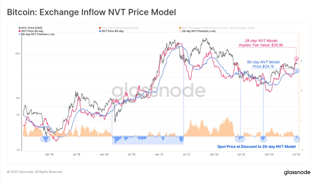Źródło: GlassnodeNa podstawie aktywności związanej z kupnem/sprzedażą Glassnode stworzył model NVT Price, wcześniej opracowany przez Willa Woo. Model ma na celu określenie „wartości godziwej” Bitcoina. W perspektywie krótkoterminowej czyli 28-dniowej, model w tej chwili implikuje „wartość godziwą” na poziomie 35,9 tys. USD, czyli powyżej cen spot po raz pierwszy od listopada 2022 roku. Wolniejszy model 90-dniowy również gwałtownie wzrósł. Nadrabia zaległości z poziomu 24,7 tys. dolarów.