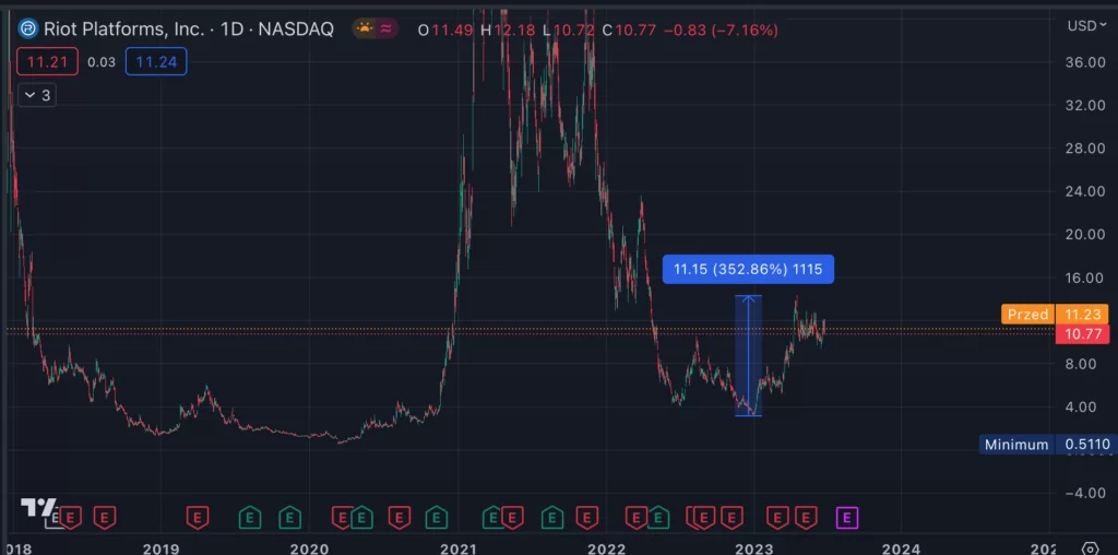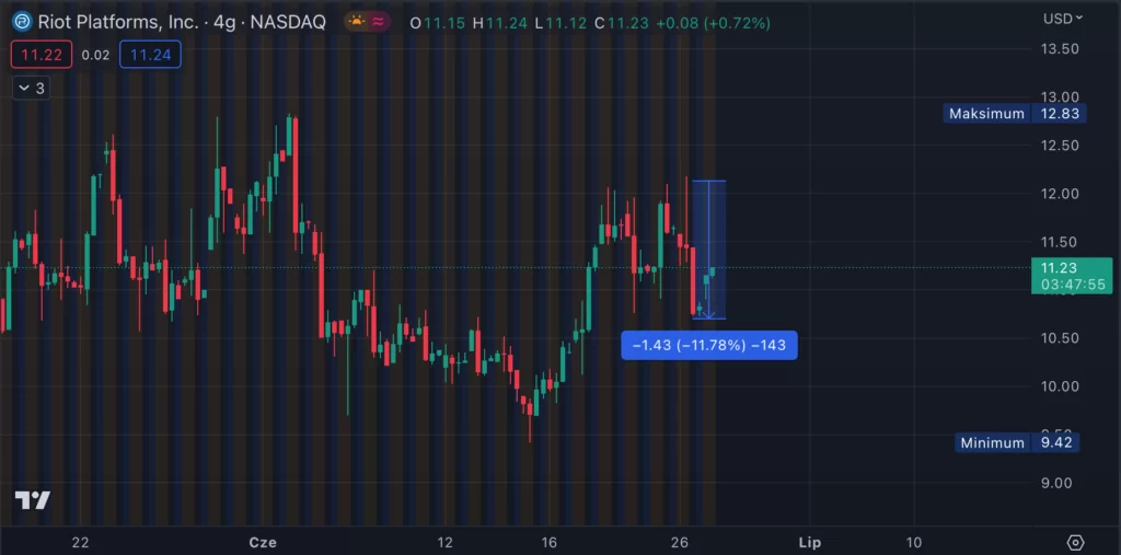 Wbrew rynkowym oczekiwaniom, ogłoszenie tej ogromnej inwestycji przez Riot Platforms spowodowało spadek ceny akcji. Na amerykańskim NASDAQ, na poniedziałkowym otwarciu akcje Riot Platforms (Ticker RIOT) zaliczyły prawie dwunastoprocentowe obniżenie ceny. Za to od początku roku akcje tej firmy wzrosły 3,5-krotnie.