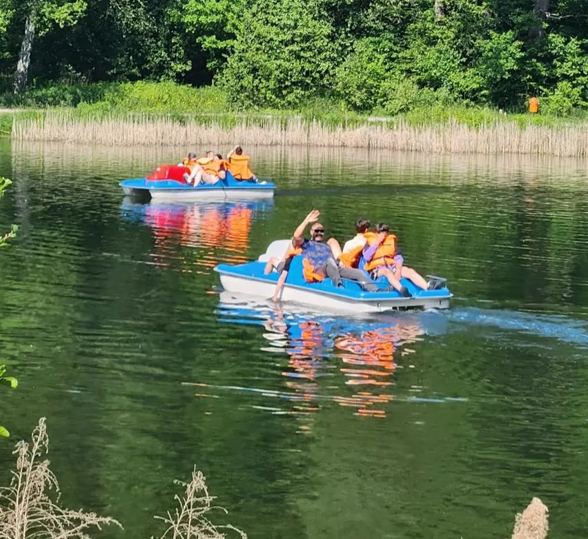 Drugiego dnia wspólnie spędzonego weekendu wybraliśmy się nad jezioro. Przez cały ten dzień w otoczeniu natury trwały gry i zabawy. Jedną z przygotowanych atrakcji był park linowy. Dzieci mogły wybrać sobie dopasowaną do ich potrzeb trasę trudności lub zostać na dole i poćwiczyć strzelanie z łuku. Kolejną formą rozrywki była eksploracja jeziora przy pomocy rowerków wodnych i kajaków.
