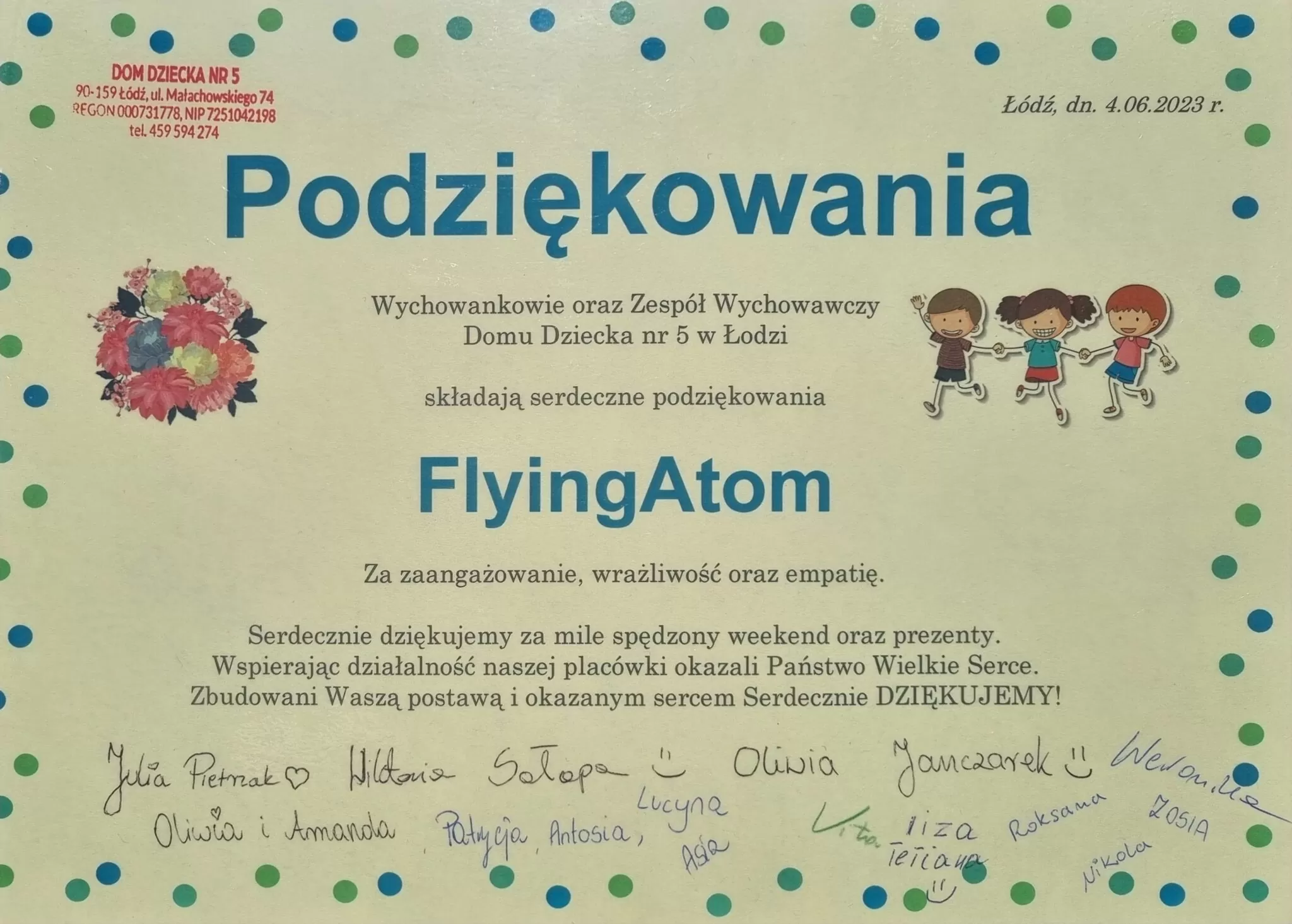 FlyingAtom i FlyingAtom Gold z kolejną wizytą w Domu Dziecka numer 5 w Łodzi. Tradycyjnie jak co roku, grupa FlyingAtom wraz z przyjaciółmi firmy przygotowała dla wychowanków placówki weekend pełen atrakcji – wszystko za sprawą Dnia Dziecka.