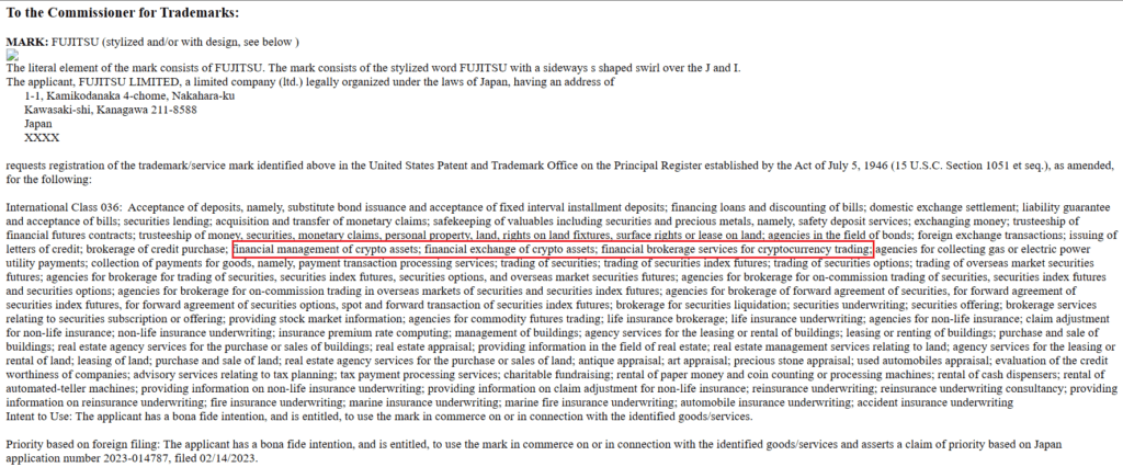 Japoński gigant technologiczny Fujitsu złożył wniosek o znak towarowy w Urzędzie Patentów i Znaków Towarowych Stanów Zjednoczonych (USPTO), ujawniając zamiar oferowania usług brokerskich w zakresie handlu kryptowalutami, między innymi kryptograficznymi i niekryptograficznymi instrumentami finansowymi.