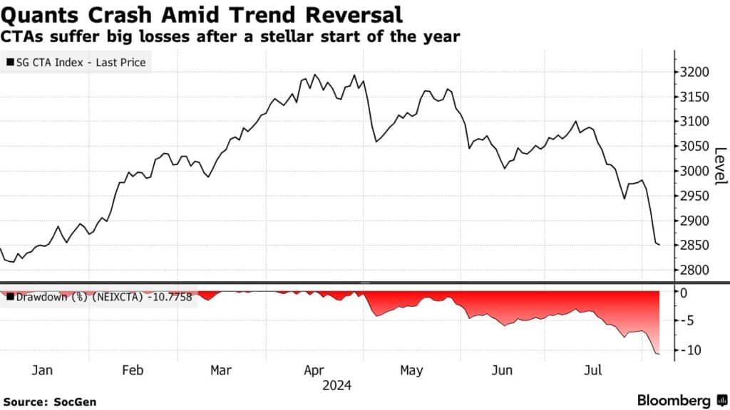 „Przeszacowanie perspektyw wzrostu gospodarczego i niewielkiego, oczekiwanego wpływu stóp procentowych pod koniec czerwca, w połączeniu z rosnącymi obawami dotyczącymi danych z USA, spowodowało gwałtowne odwrócenie (…) Te dobre wyniki na początku roku wynikały głównie z trendu wzrostowego cen akcji i towarów”, pisali w nocie do inwestorów analitycy Societe Generale, cynowni przez agencję Bloomberg.