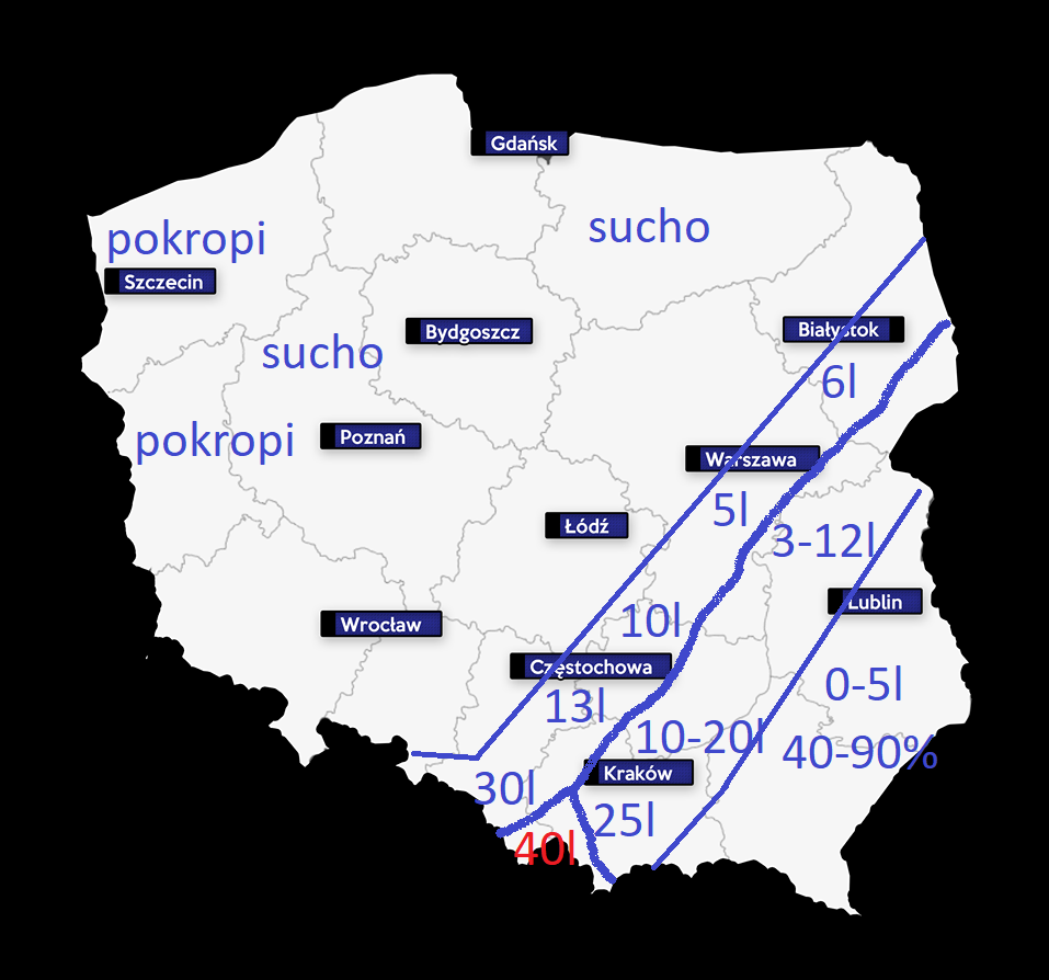 Przez cały dzień padać ma w wąskim pasie od Siemiatycz po Siedlce, Garwolin, Radom, Kielce, Kraków, Katowice a po południu rozpada się w Nowym Sączu, Limanowej, Tarnowie. Na wschodzie opady będą przelotne a więc losowe. W jednych wsiach popada a w innych choćby nie pokropi.