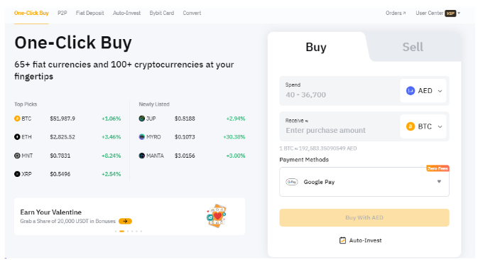 Gdy środki dotrą na Twoje konto jesteś gotowy, aby rozpocząć handel. Bybit oferuje intuicyjną platformę handlową, która umożliwia łatwe kupowanie i sprzedawanie kryptowalut. Zacznij od zapoznania się z interfejsem i dostępnymi narzędziami. Najłatwiejszą opcją jest wybór opcji “Kup krypto” i zakup jednym kliknięciem. Wówczas interfejs wygląda tak: