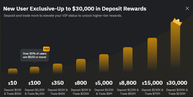 Tak, Bybit oferuje bonus za rejestrację dla nowych użytkowników. Może on wynieść choćby do 30 000 USD. Należy jednak skorzystać z linka promocji.