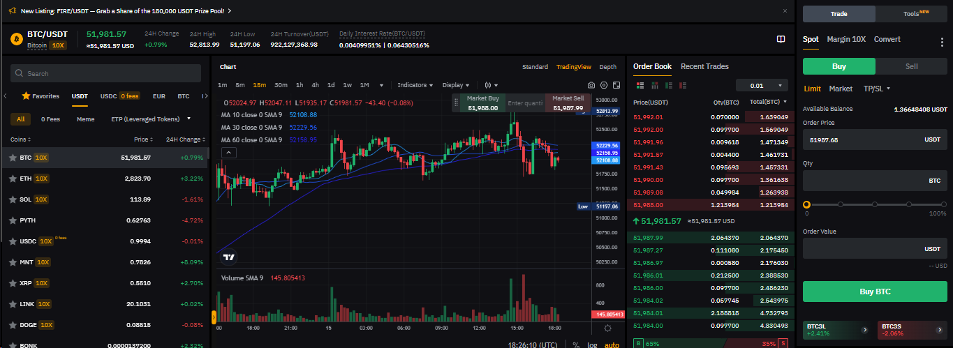 Jeśli chodzi o interfejs dla rynku spot czy kontraktów terminowych to wygląda on bardzo podobnie jak na innych giełdach.