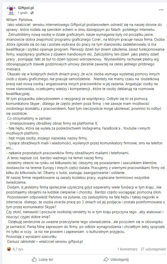 Ad rem, i zarazem w uproszczeniu – jak powtarzają od wczoraj liczne media tradycyjne, społecznościowe oraz przekazy internetowe, wspomniana firma Giftpol zatrudniła graficzkę. Po czym niemal natychmiast ją zwolniła.