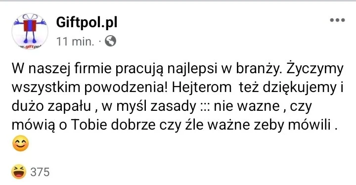 Bezmiar internetowej popularności, którą w wyniku publikacji całej tej historii Giftpol raptownie zdobył, najwyraźniej okazała się bowiem zbyt wielkim brzemieniem do udźwignięcia. Pan Jabłoński był co prawda uprzejmy wspomnieć, iż nagły fakt ogromnej rozpoznawalności marki, która firma w tej chwili się cieszy, to powód do zadowolenia, komentując to słowami „nieważne co mówią, ważne by mówili” .