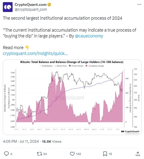 Źródło: https://x.com/cryptoquant_com/status/1811401541938499821Poprzednie takie duże zakupy rynek obserwował na początku roku, co miało związek z wprowadzeniem funduszy spotowych Bitcoin ETF. Wówczas dopuszczenie tego produktu było głównym motorem napędowym popytu. Tym razem, zdaniem analityka, nie ma wątpliwości, iż mamy do czynienia ze skupowaniem dołków.