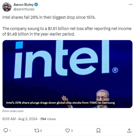 Szczególnie bolesne straty odniósł Intel, którego akcje stracił aż 26%. W tym przypadku główną przyczyną był wyjątkowo słaby raport kwartalny. Ujawnił on kiepską sytuację firmy. Kondycja Intela jest na tyle zła, iż kierownictwo wstrzymało wypłaty dywidend oraz ogłosiło, iż zwolni 15 tys. osób, by ratować firmę. Od początku roku akcje giganta straciły już około 40%. Wielu ekspertów wskazuje, iż firmy przespała rozwój AI i teraz płaci za to słoną cenę.