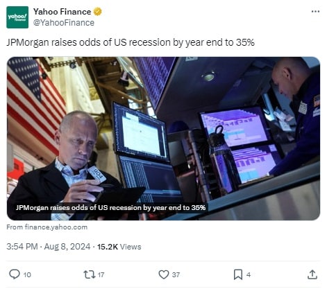 Jedną z takich instytucji jest JPMorgan, który podniósł prawdopodobieństwo wystąpienia recesji w USA do końca roku do 35%. Jeszcze na początku lipca gigant szacowała, iż jest 25% szans na recesję. Jednocześnie JPMorgan jest mniej optymistyczny co do utrzymania stóp procentowych. W czerwcu instytucja oceniła, iż jest 50% szans na to, iż Rezerwa Federalna utrzyma je na obecnym poziomie. Po ostatnim krachu JPMorgan prognozuje, iż jest zaledwie 30% na utrzymanie stóp procentowych na obecnym poziomie.