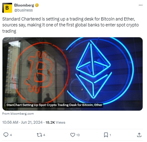 Źródło: https://twitter.com/business/status/1804076000231268766Standard Chartered, w oświadczeniu mailowym przesłanym między innym do Bloomberg i CoinDesk napisał: „Ściśle współpracowaliśmy z naszymi organami regulacyjnymi, aby wspierać popyt naszych klientów instytucjonalnych na handel Bitcoinami i Ethereum, zgodnie z naszą strategią wspierania klientów w szerszym ekosystemie aktywów cyfrowych, od dostępu i opieki po tokenizację i interoperacyjność”.