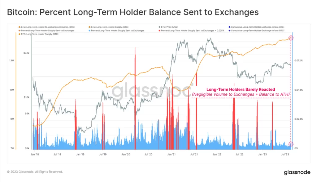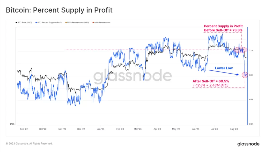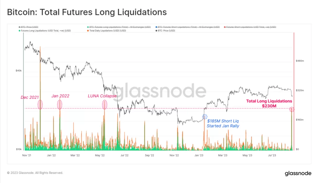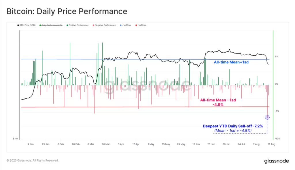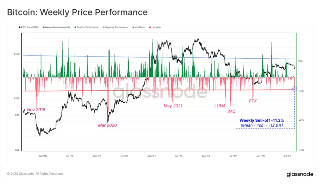 Źródło: GlassnodePowyżej widzimy, iż spadek BTC o ponad 7% w dniu 17 sierpnia był jednym z większych. dziennych ruchów w ostatnich latach (choć daleko mu do skali porównywalnej z covidem, Luną, 3AC czy FTX). Tygodniowa zmiana cenowa wyniosła -11,3%. To jest znaczącą korektą, ale niespecjalnie dużą patrząc historycznie. Wynik ten jest nieco niższy od długoterminowego ruchu o jedno odchylenie standardowe wynoszącego -12,6%, poziomu, który został przekroczony podczas dużych kapitulacji, takich jak upadki FTX, 3AC i LUNA.
